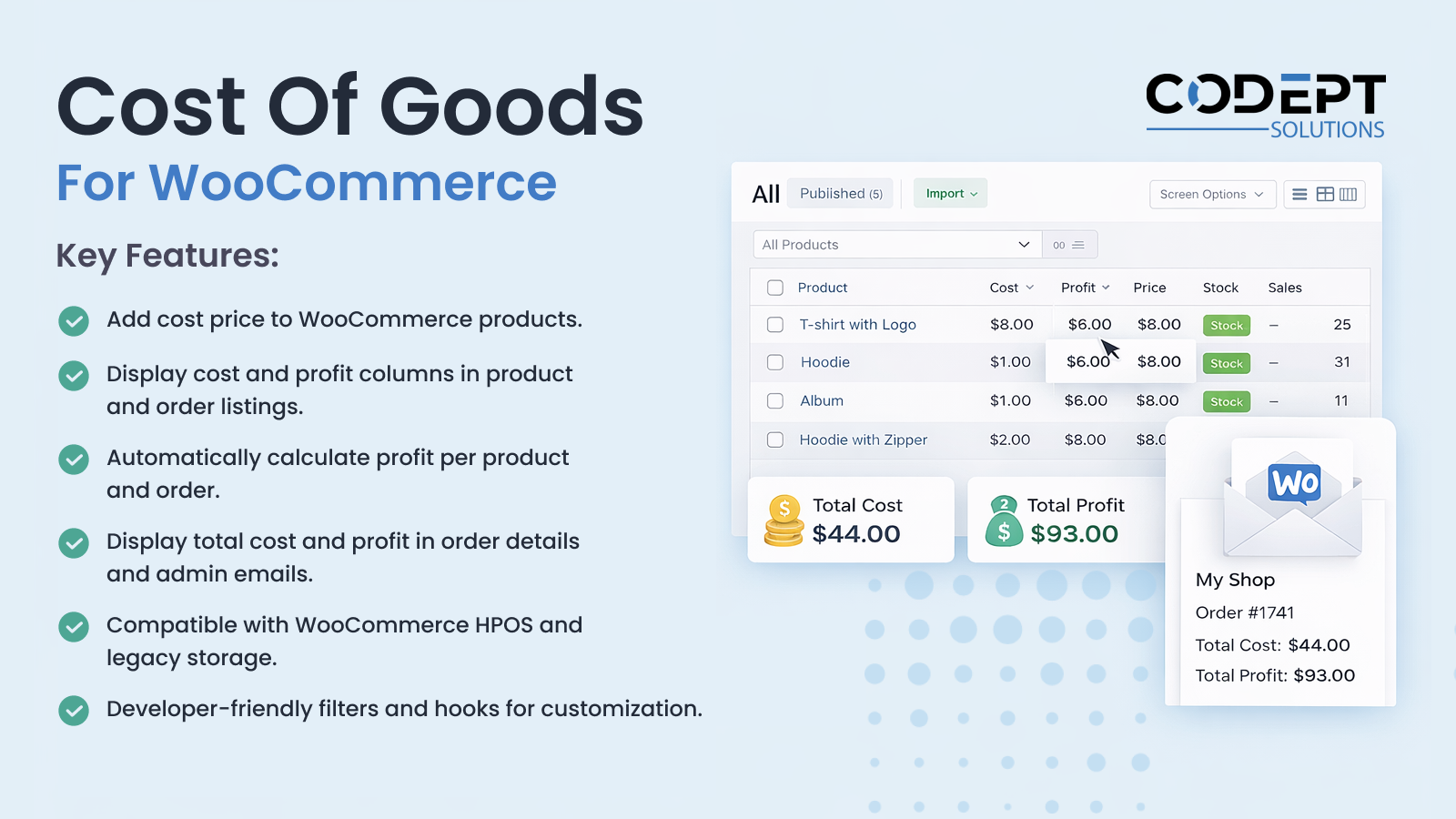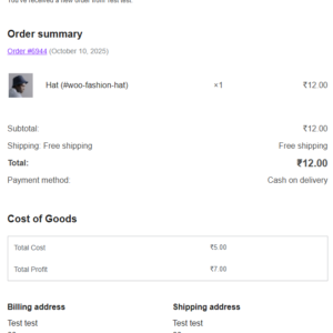 The plugin seamlessly integrates with WooCommerce, displaying cost and profit data in product edit page, order listing, order details, and admin emails. It fully supports WooCommerce High-Performance Order Storage (HPOS) as well as legacy storage.