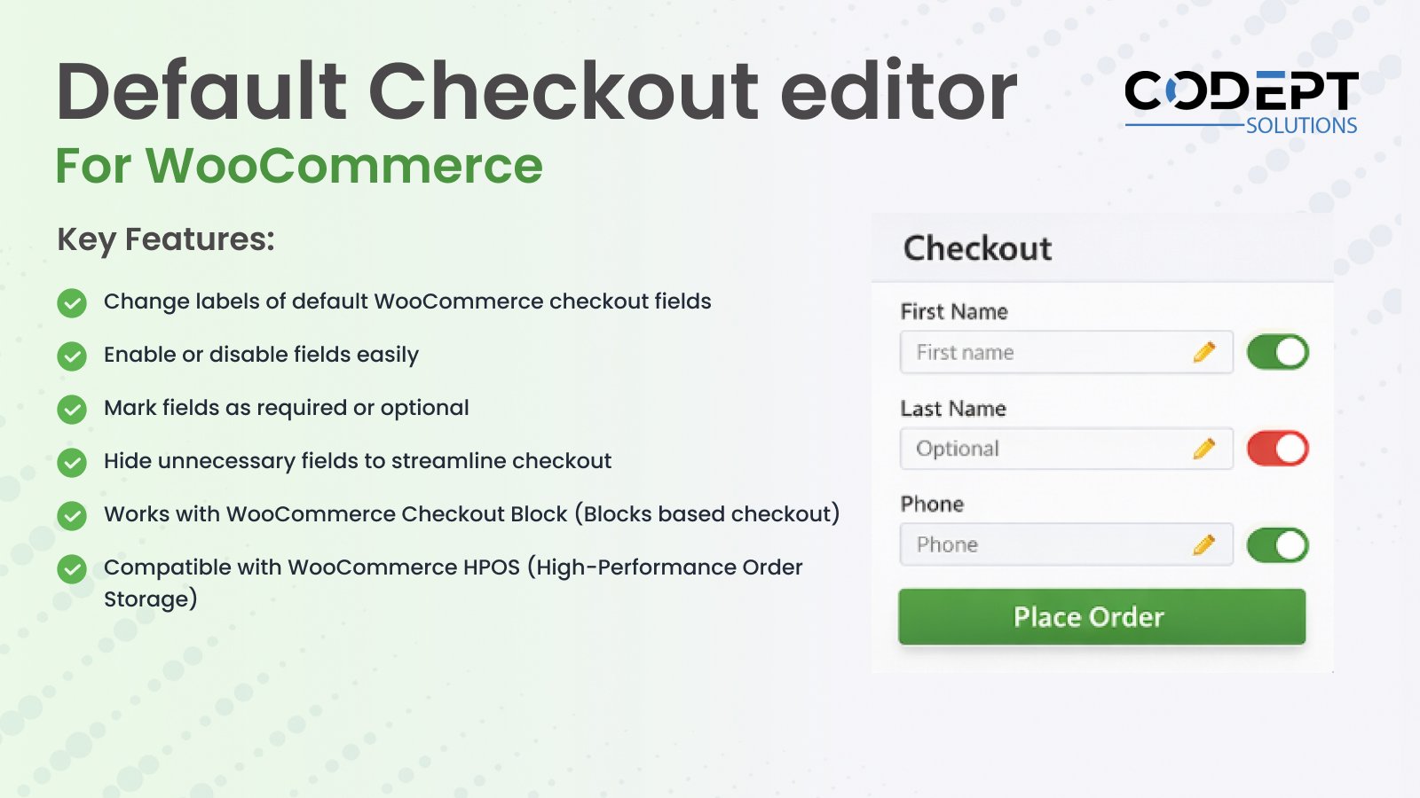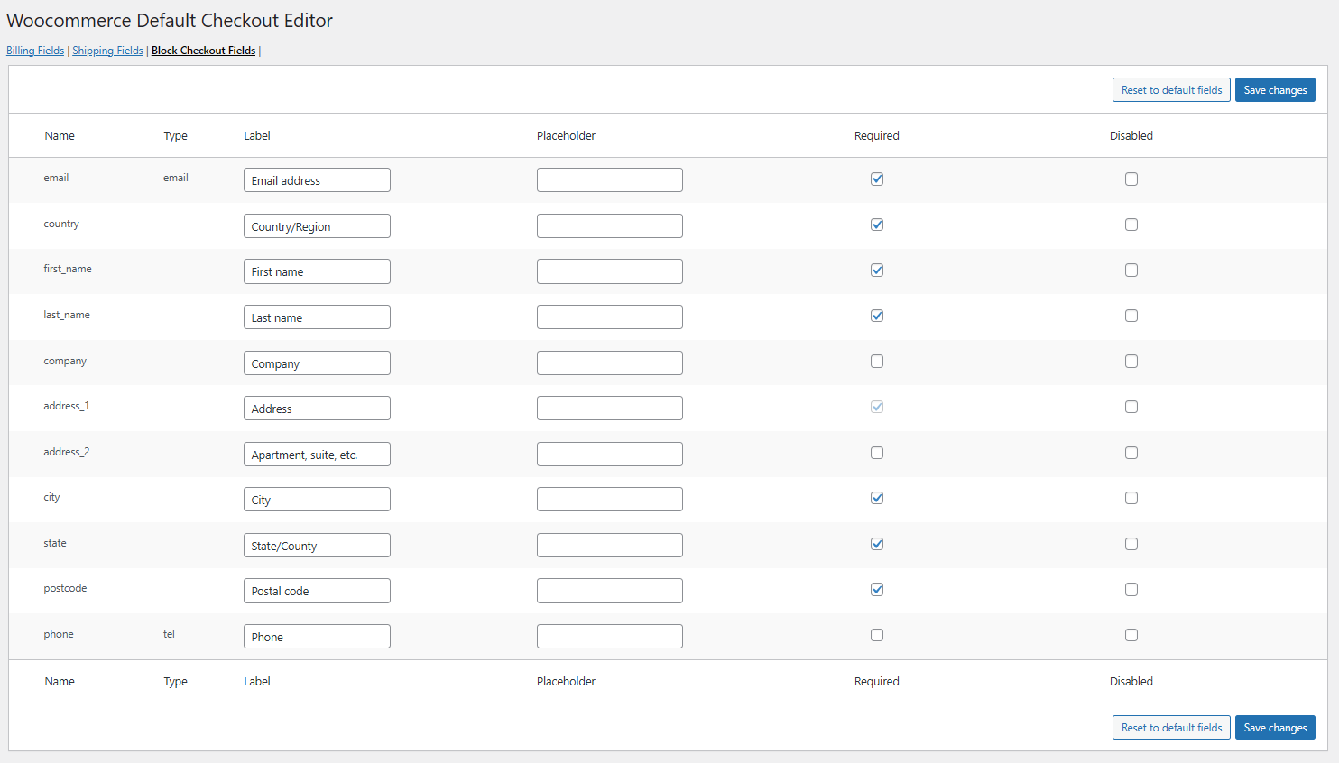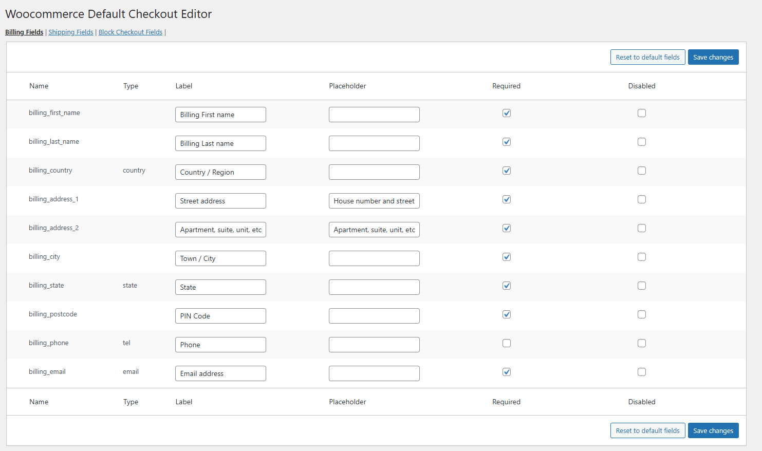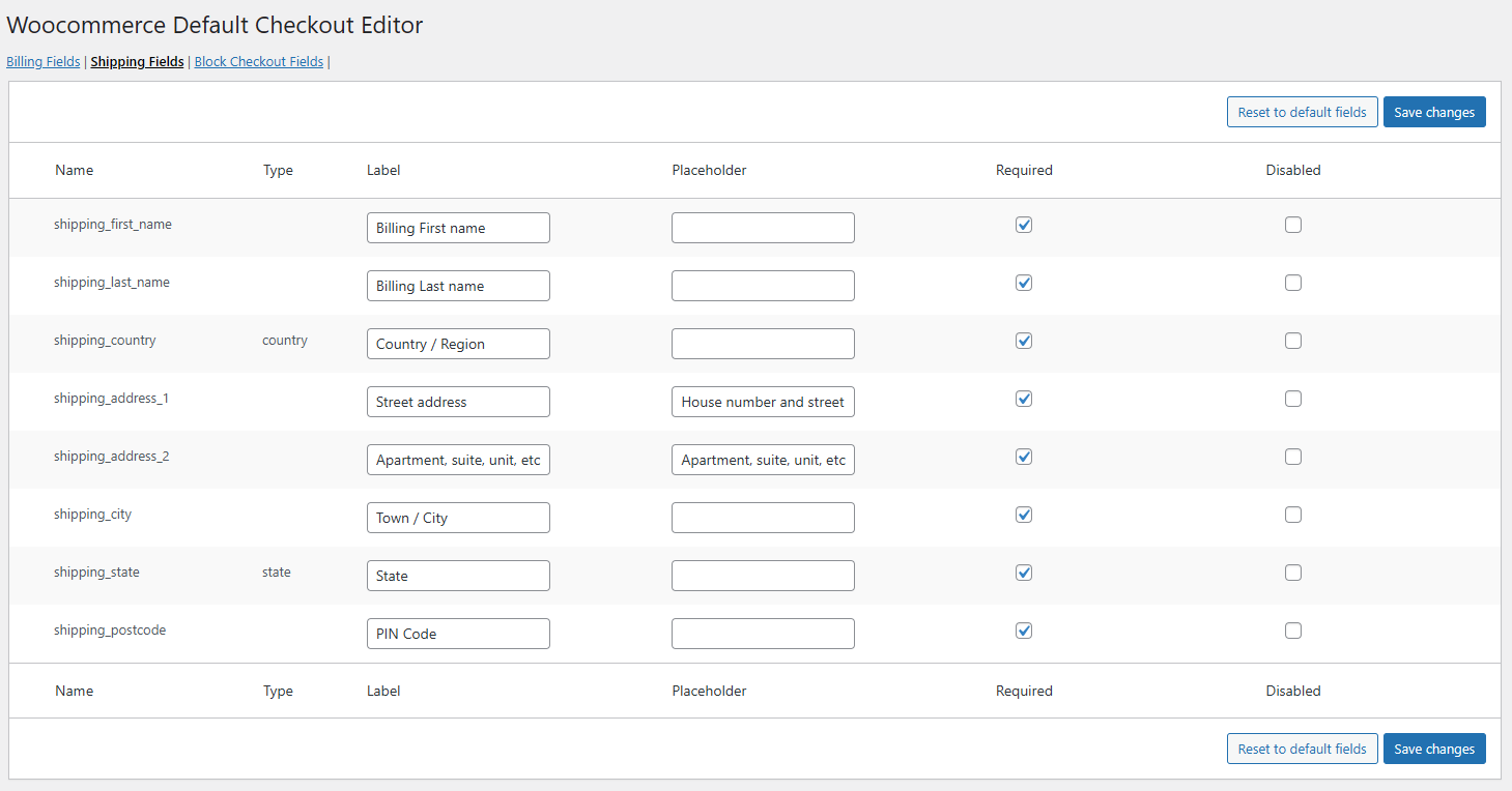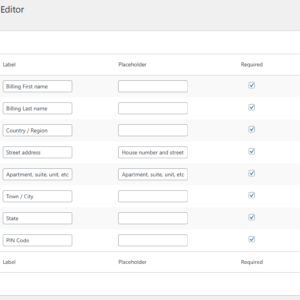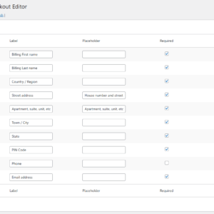 WooCommerce Default Checkout Editor allows you to customize the default WooCommerce checkout fields with ease. You can enable or disable fields, change labels, and mark fields as required or optional — all from a simple admin interface.